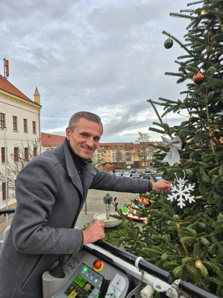 Weihnachtsbaum auf dem Oscherslebener Marktplatz feierlich geschmückt